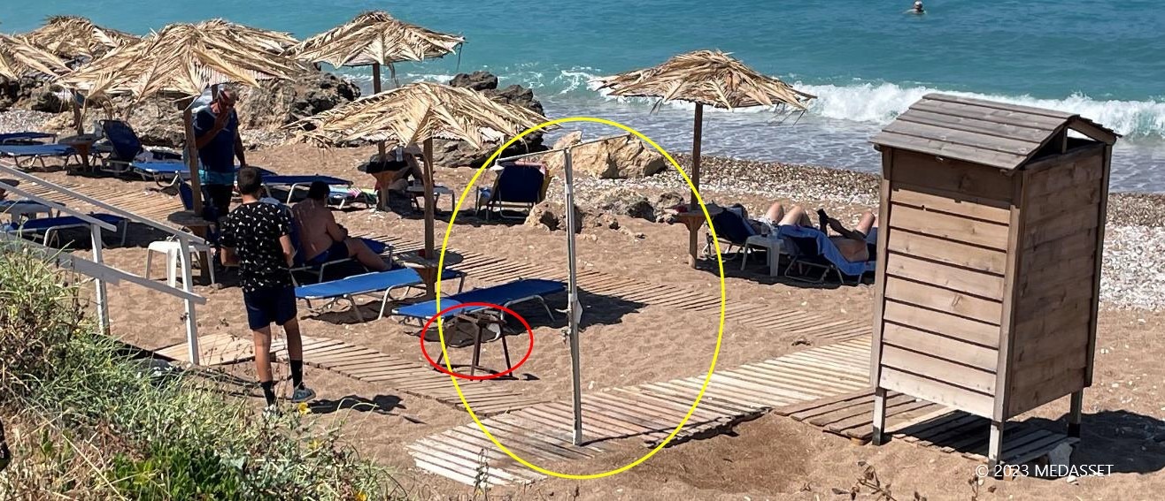 6 Ιουλίου 2023: Παραλία ωοτοκίας στο Καλό Νερό, Κυπαρισσίας. Ξύλινοι διάδρομοι ανάμεσα σε φωλιές χελωνών, τοποθετημένοι από παραλιακές επιχειρήσεις, που δεν έχουν απομακρυνθεί ούτε έχουν εφαρμοστεί τα πρωτόκολλα αποξήλωσης. Νερό από ντους (κίτρινος κύκλος) ρέει στην παραλία ωοτοκίας. © 2023 MEDASSET, φώτο Νάντια Ανδρεανίδου.